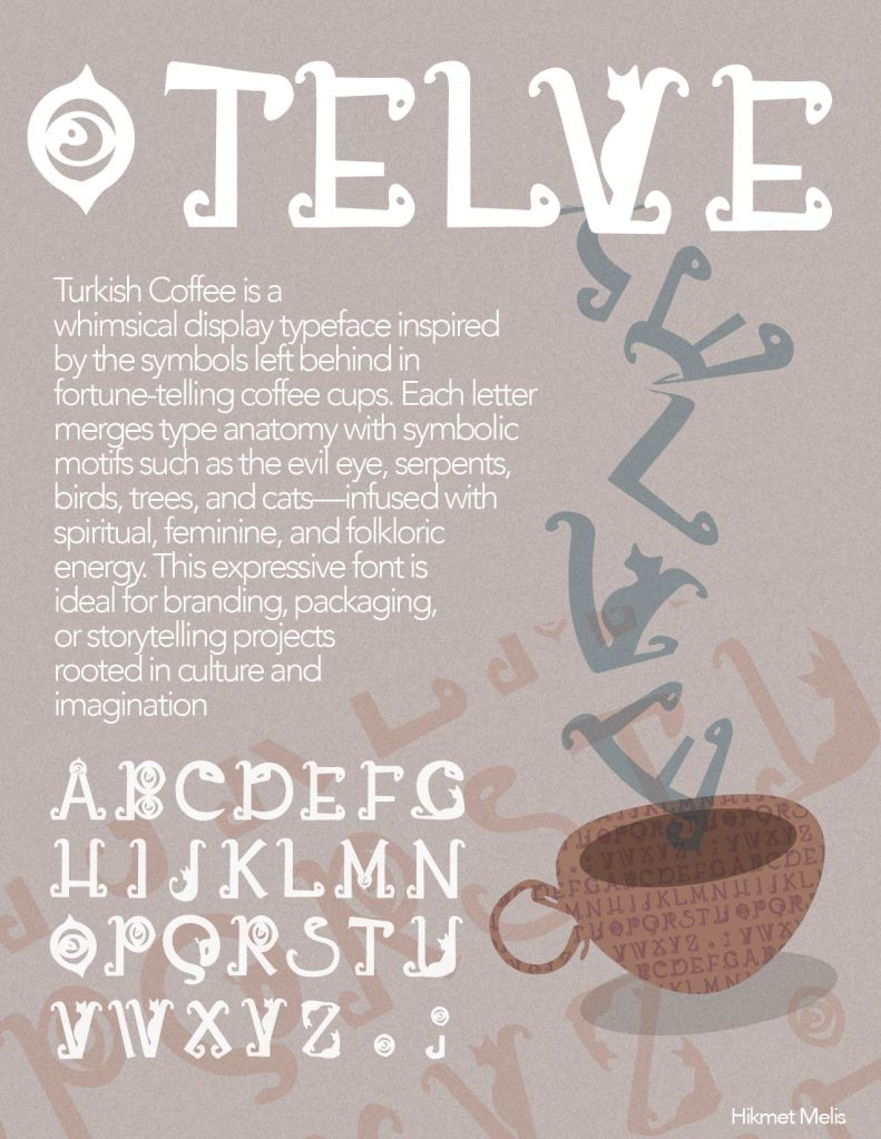 Telve is a whimsical display typeface inspired by the symbolic images left behind in Turkish coffee cups during fortune-telling rituals. Each letterform merges classic type anatomy with cultural motifs—serpents for transformation, the evil eye for protection, cats for mystery, birds for messages, and trees for growth.